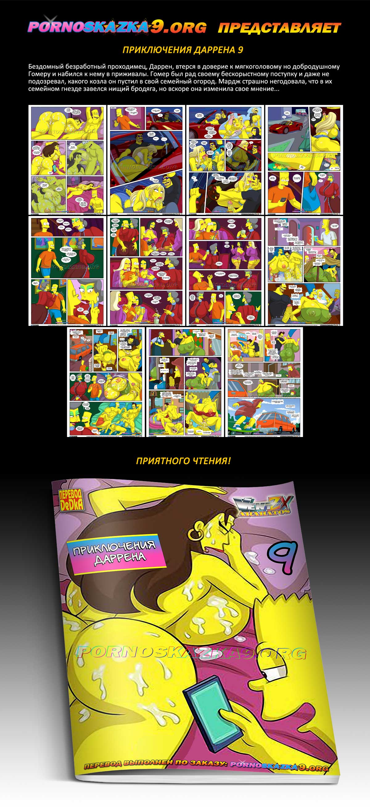 Порно комикс Приключения Даррена. Часть 9. Бездомный безработный проходимец, Даррен, втерся в доверие к мягкоголовому но добродушному Гомеру и набился к нему в приживалы. Гомер был рад своему бескорыстному поступку и даже не подозревал, какого козла он пустил в свой семейный огород. Мардж страшно негодовала, что в их семейном гнезде завелся нищий бродяга, но вскоре она изменила свое мнение…